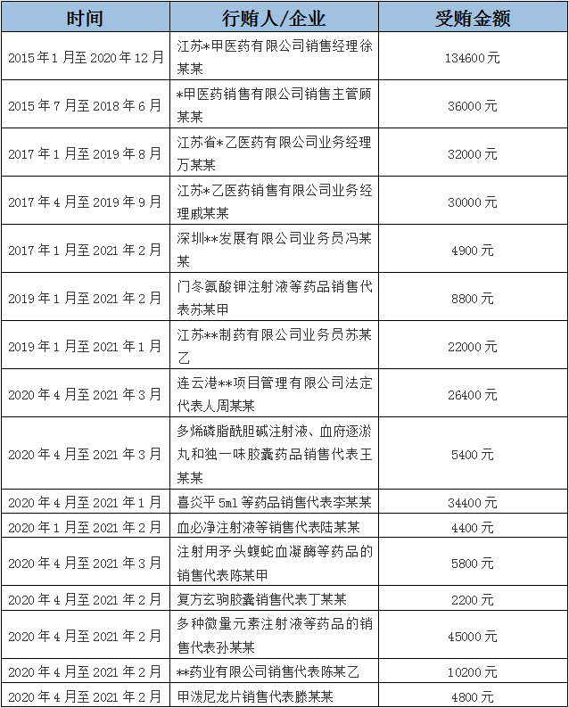 被告人共收受16名企业、药品销售人员的贿赂,从表格可以看出,受贿时间最早可以“追溯”到2015年,近期受贿的时间是在2021年3月。江苏*甲医药有限公司销售经理徐某某向被告人行贿的时间长达近5年之久。而且,在同时间段出现了重复受贿的情况(不同企业、销售人员):在2020年4月-2021年2月共有多名销售人员向其行贿,涉及药品为复方玄驹胶囊、多种微量元素注射液、甲泼尼龙片。