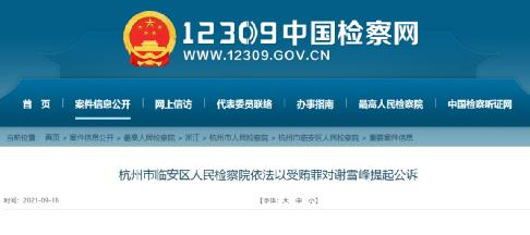 9月18日,杭州市临安区人民检察院依法以受贿罪对谢雪峰提起公诉;