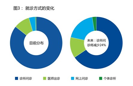 现在有很多潜在的创新点(如图2),可通过专注于一个服务细分市场从而形成颠覆的潜力,例如基础治疗实践的医疗补助计划。医疗组织可利用合作协同,不受限于现有的付费模式,设计出不同的临床模式。通过整合成统一平台,其他医疗组织可获取临床EMR等数据。医师的健康计划可以为慢性病护理和疾病管理,配置更低的成本和更方便的临床模式,可以获取更多患者资料等等。这样,上门就诊的患者数量减少,医师可以提供更高水平的临床服务,也有更多时间研究复杂病例(见图3)。