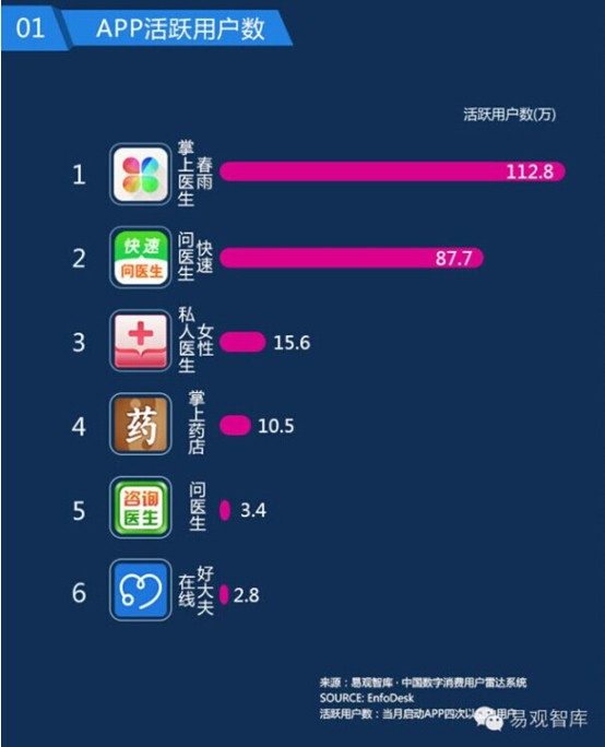易观智库8月发布的2014年7月移动健康医疗类APP数据分析中,APP活跃用户数,增速对比的前六名中都没有微医的身影。也就是说,微医的月活跃用户数