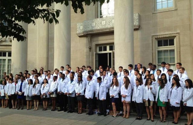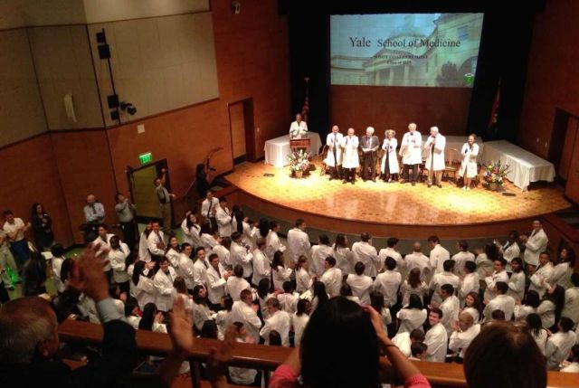 上面两张图为耶鲁大学医学院新生入学的白大褂仪式。耶鲁大学是美国医学院中录取人数最少的医学院,每年录取人数为100人,50男,50女, 平均录取率2-2.5%。美国大部分学校医学院每年录取人数在200-280 左右。