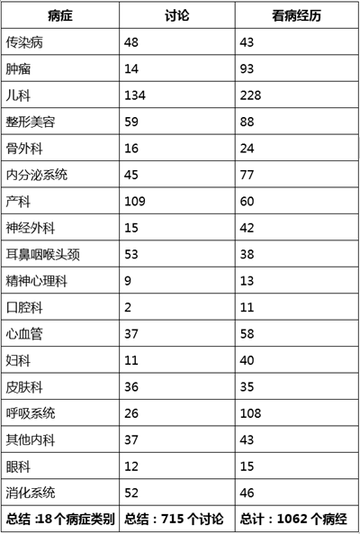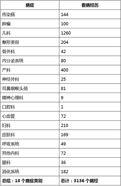 Dr.2统计了看处方上所有的病症类别和每个类别中患者分享的看病经历的数量情况:截止2014年8月24日:23441 条提问和讨论,21837 条经验和分享。