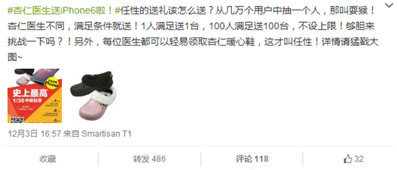 4、活动平台:以“杏仁APP”为主场,而医生在抽取奖品时,同时是一种使用体验,培养用户使用习惯。据称送出的iPhone在110部左右。