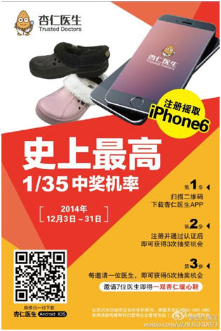 2、此次病毒营销主力活动送iPhone6是用户增长的关键,按照其海报的提法,摇奖概率为用户数的1/35,要不然是耍猴,或者部分人理解为是邀请7个医生获