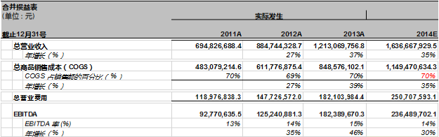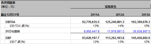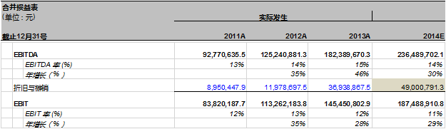 根据以上预测,我们计算出万达信息2014年EBITDA为236,489,702.1元. EBITDA 率为14%。这个比例和过去三年的EBITDA率大致相当,然而, EBITDA的同比增长率则由2013年的46%下降到30%。