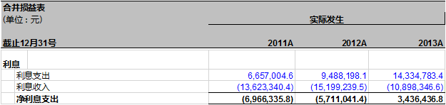 等借贷所产生的利息组成。除了短期借款之外,万达信息年报披露了其他债务的利率。利息收入则主要是由存款或其他投资产生。万达信息并没有在年报里披露存款利率。市面上的短期存款利率为0.35%。但2013年,万达信息的利息收入为10,898,346.6元。我们从年报披露的资产负债表得出2013年12月31号万达信息所持有的现金额为742,280,694.1, 2012年12月31号企业所持有的现金额为779,964,737.6元。我们可以假设2012年12月31号万达信息所持有的现金额等于2013年年初所持有的现金额。这样,根据市面上0.35%的短期存款利率计算出利息收入=(742,280,694.1+779,964,737.6)/2 *0.35%= 2,663,929.5。这似乎远远低于万达信息的利息收入。我们可以推测金融机构给万达的利率远高于市价,由此,我们推算出万达信息所享受的存款利率应为10,898,346.6/(742,280,694.1+779,964,737.6)/2=1.43%,那么或者是其部分为定期存款,或者是直接与银行签订的协议存款利率。
