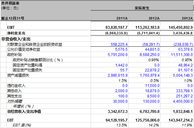 所以,在调整后的万达信息利润表里, EBT=EBIT-利息-非经营收入/支出净值。万达信息过去3年的EBT率表现相对平稳。 2013年略微低于2012年和2011年。