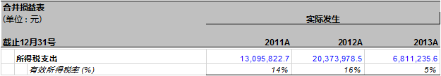 我们可以留意到2013年万达信息的所得税支出同比减少67%,有效税率也只有5%。万达信息年报的解释为:”重点软件企业认定导致减少“。但根据去年其前三季度的实际所得税率约为10%,所以2014年大概率为10%。