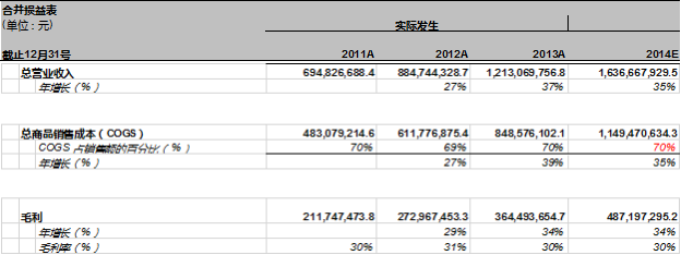 我们预测2014年万达信息的毛利为487,197,295.2元.年同比增长34%,这和2013年的年增长率保持一致。 2014年的毛利率和过去三年一样,保持在30%左右。
