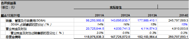 我们发现万达信息的销售,管理和行政费用占营业收入的比例在过去三年分别为:14%(2011), 16% (2012) 以及15%(2013)。同营业成本一样,这个比例在过去三年非常地稳定和一致。那么这就意味着万达信息的销售,管理和行政费用会跟随营业收入的增长而同比例的增长。是典型的变动成本。那我们应该怎样预测万达信息2014年的销售,管理和行政费用呢?我们做如下假设: