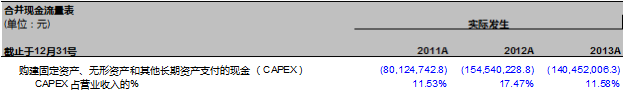 现在,我们要预测2014年的资本支出。我们还是先看看过去三年资本支出的情况。我们从万达信息年报里找到过去三年的合并现金流量表。我们来比较一下, 如下表18-3所示: