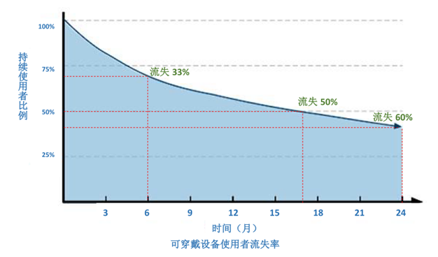 大约半年后,2014年1月,另一家美国市场调研公司Endeavour Partners发表研究报告显示,到2013年9月为止,在美国18岁以上的人口中,每10人就有1人使用可穿戴设备(Jawbone, Fitbit, Nike, Misfit等)。所有的设备厂家都宣称利用移动网络强大的能力提供了独特的方法来满足用户的需要和偏好。然而在对使用者进行24个月的跟踪调查中,在6个月时,33%的使用者会停止使用可穿戴设备;17个月左右,50%的使用者会停止使用可穿戴设备;24个月时,60%左右的使用者会停止使用可穿戴设备。如图一显示: