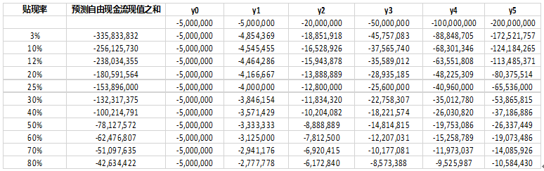 在以上这种情况下,我们如果用DCF方法来给万事发估值的话,问题就出现了,无论你用什么样的贴现率,从y0到y5所有的自由现金流都是负向的。贴现率越高,自由现金流的现值就越低。如果是这样的话,假设早期的天使投资人和风险投资人都拿着放大镜来看被投企业的自由现金流的话,估计不会有多少风险投资会发生。因为,无论我们用什么样的贴现率,得出的投资现值都是负的。