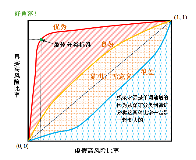那么如何解读接收者操作特征曲线呢? 首先我们注意到有一条从(0,0)到(1,1)的对角线,把图示的方块分成了一上一下两个三角形。任何落在方块下半部的那个三角形区域的ROC曲线是没有意义的,因为那个贯穿(0,0)和(1,1)点的对角线代表的是我们随机预测所会得到的ROC曲线,也就是说,如果我们什么模型都不要,靠随机翻硬币来决定一个个体是高风险的还是低风险的,那样翻上一万个人,我们得到的ROC曲线就会是那条对角线(真实高风险率和虚假高风险率是一半一半)。显而易见,那种靠翻硬币的预测模型是十分不靠谱的,而ROC曲线如果落在那条对角线之下,说明这个预测模型比翻硬币模型还要糟糕,自然是没有用的。图中的红色ROC曲线代表了一个十分优秀的预测模型,它表示这个模型的分类预测结果相当好。这是怎么看出来的呢?主要就是看AUC,即ROC曲线下的区域面积。这个面积越接近于1(1是这个方块的面积,也是AUC可能达到的最大值),ROC所代表的预测模型综合预测能力越强。这就是为什么我们称(0,1) 这个角落为好角落,因为ROC曲线越贴近这个角落就越理想。但是单凭AUC还是不够的,我们还要看是否能在曲线上找到一个点有着足够高的真实高风险比率和足够低的虚假高风险比率,这个点所代表的分类标准就是最佳分类标准。(题外话:还有其他有效的衡量预测模型好坏的标准,本文就不赘述了。今后有机会,会在其他文章或讲座中提到)。