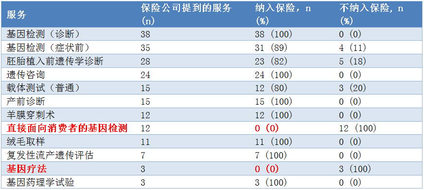 美国一家名为DNA Direct公司针对206家拥有50,000会员以上的医疗保险公司进行了一项市场调查。有66家对外公开了他们的保险条例,其中有 65家(98%)对遗传基因检测提供了保险服务。他们具体的保险范围如下: