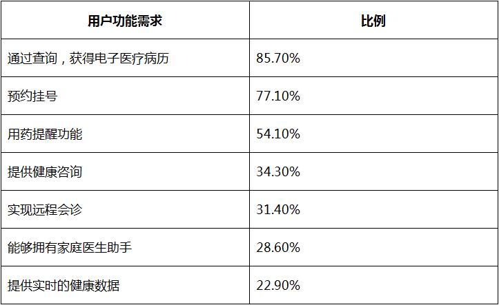 据我国去年公布的移动医疗年报数据来看,目前普通消费者对移动医疗APP最大的功能需求是通过查询获得电子医疗病历,其次是预约挂号,随后是用药提醒、健康咨询、远程会诊等: