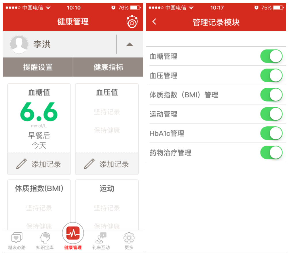 ③记录数据: 分为血糖管理、血压管理、体质指数(BMI)管理、运动管理、HbA1c管理以及药物治疗管理。每个记录模块都可以单独关闭或者打开。
