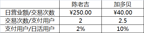 每笔交易的价值就大有文章可做了,你可以增加App内功能的种类,类似电商的SKU,这样支付用户在购物时就有更多的选择。你也可以尝试增加产品的价格,如果你的产品有差异化且比其他产品服务更好的话。但无论你用什么方法,起码看起来提升的空间都比前面两个指标来得大得多。如果你能将每笔交易的价值从现在的40元提升到50元,也就是说每笔交易增加了10元,其他条件保持不变。那么,你每日增加的营业额就为2500元(10*2.5*100)。这可是一笔巨大的提升哦。所以我认为,提升加多贝App内消费营业额的支点在怎样增加每笔交易的价值。