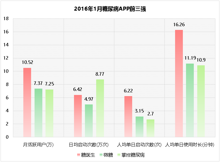 在拉出各家糖尿病APP在2016年1月的数据之后,笔者发现,月活跃用户数三四名与后面之间差距已经相当大,第五名与第一名的活跃用户数差距已超过5倍!前三强的数据还是相当强劲的,我就将糖医生、微糖、掌控糖尿病这三家的数据拉出来分析一下: