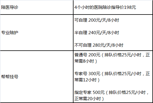 4. 全程协助、陪伴客户排队取号、医生面诊、预约检查、取送标本、划价缴费、排队取药、输液陪伴、取送检查化验结果、协助办理入院手续等全过程门诊就医陪伴服务。标准陪伴时间为4小时,超时加收25元/小时。