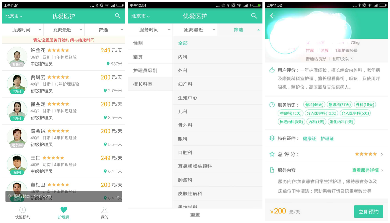 公司目前覆盖的地区是北京。优爱医护采用的是类Uber的模式,可以通过地址定位选择医院护理和到家护理两种方式,把居家和医院两个护理场景联系在一起。页面简单易操作。用户发出订单之后,平台会根据服务地址自动选出3名护工,让用户在15分钟做出挑选,如果不满意就取消。除了APP预约,用户还可以通过400和微信预约。