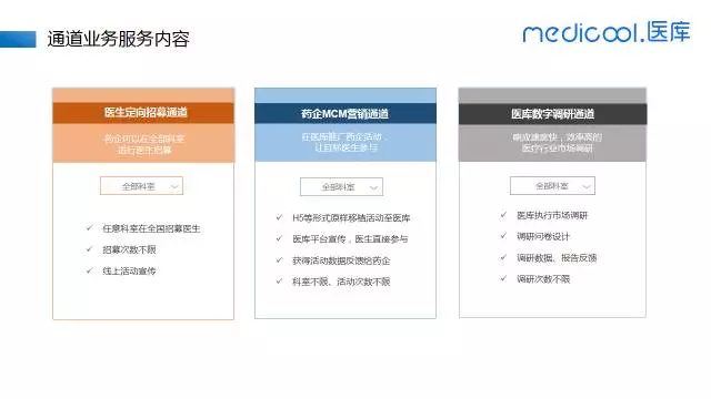 因此医库将数字营销服务做成了标准化的通道业务,把准入门槛降低。对药企来说请客户吃饭、参加一个学习班、做一个招商会都不止十万二十万,而我们医库三个通道业务的总费用,只是按企业规模从每年五万起步,到每年三十万封顶!