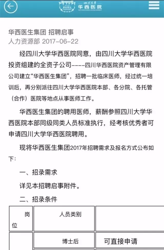 不要指鹿为马,华西的招聘只是一种不占编制的合同工劳务派遣,跟真正的医生集团没啥关系!