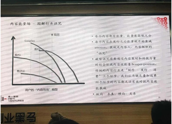 内容能量场,也就是说每个内容都有能量,从发行出去之后,能量就会开始衰减,这种情况是必然的。那么无论在内容制作、传播、还是公司运营中,我们就要想办法拉长它的生命周期,不停地利用科技手段作为载体进行有效的叠加。同时,要寻找一些低成本的方式(即成本收益最大化)来进行有效突破。