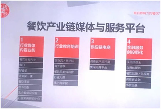 第二块是行业教育培训,包括创新营、商学院、海外游学、餐饮品类的特训、行业大课、线上商学院等等。通过全媒体的,就是全平台的线上线下结合,并且与多个第三方嫁接资源的培训形成了规模化的放大,同时还能反哺其他业务。供应链电商就包括供应链产品评测,B端的撮合,集采的电商平台,这是类似于B2B的电商。