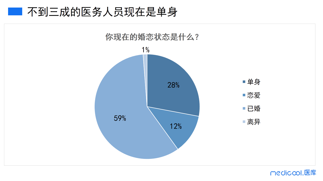 参加本次调研的人中,28%的医务人员仍是单身,12%的医务人员处在恋爱中,59%的医务人员是已婚状态,1%的医务人员是离异状态。