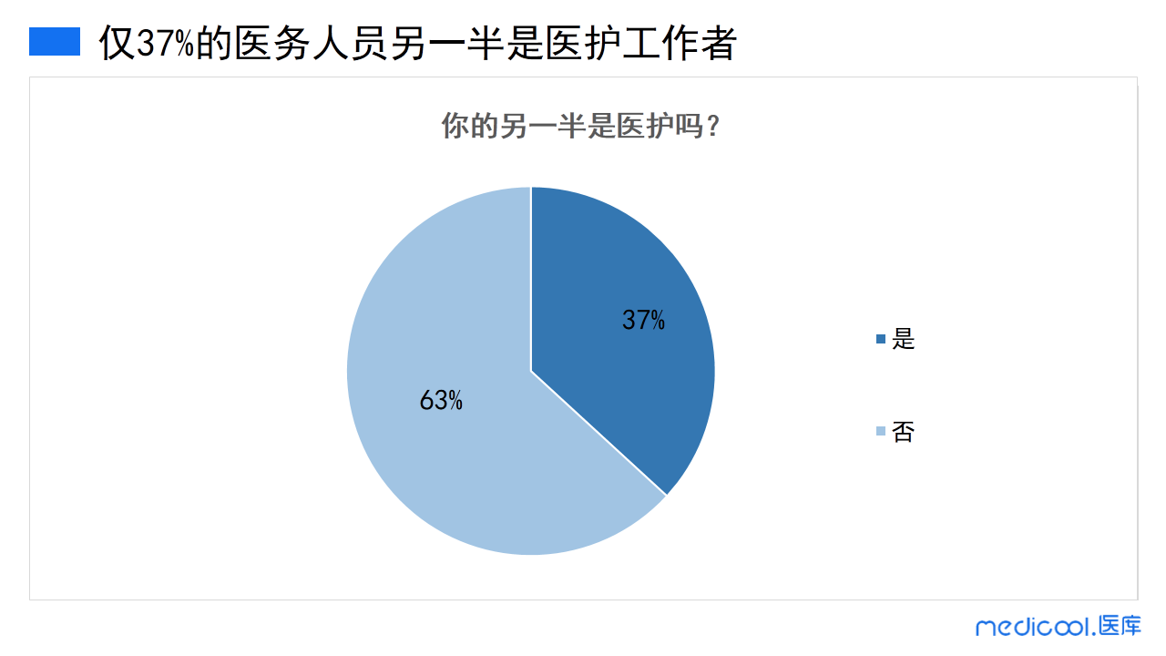 那么,医务人员会更倾向选择同行业的人作为另一半吗?由调研数据显示,仅37%的医务人员的另一半是医护工作者,63%的医务人员的另一半的职业与医护无关。