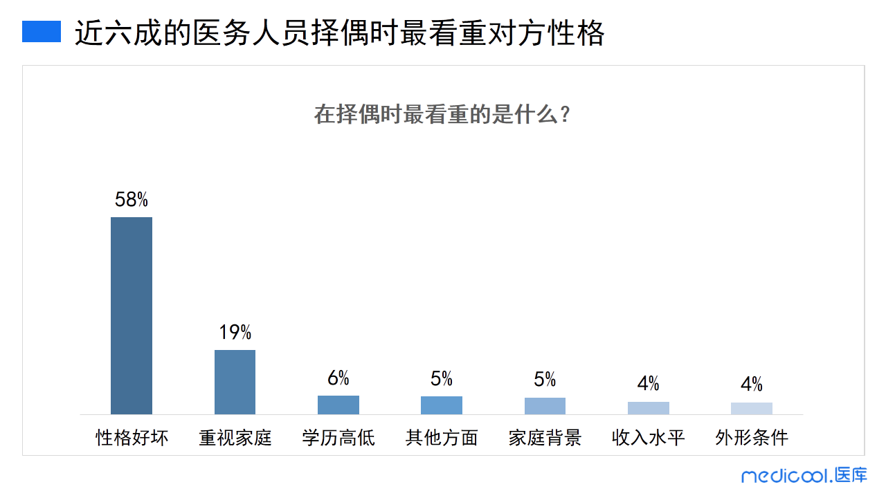 在选择另一半的时候医务人员最看重对方什么呢?58%的医务人员最看重对方的性格;其次,19%的医务人员最看重对方是否重视家庭;而学历高低、收入水平、外形条件等其他方面也是大家选择另一半时会考虑的因素。