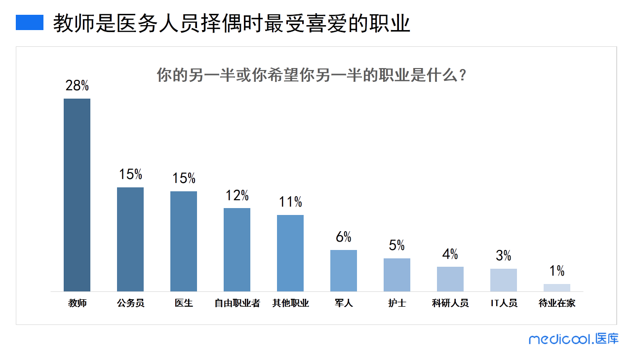 医务人员最希望自己的另一半是什么职业的呢?由本次调研数据来看,择偶时,教师职业最受医务人员的青睐,其次就是公务员、医生及自由职业者等。