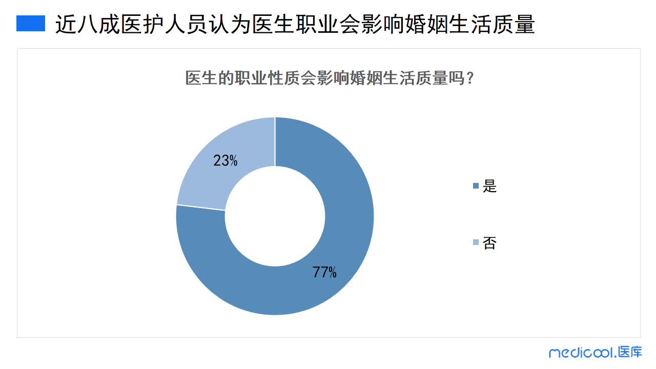 由调研数据可知,77%的医务人员认为医生职业性质会影响婚姻生活质量,23%的医务人员认为并不影响。