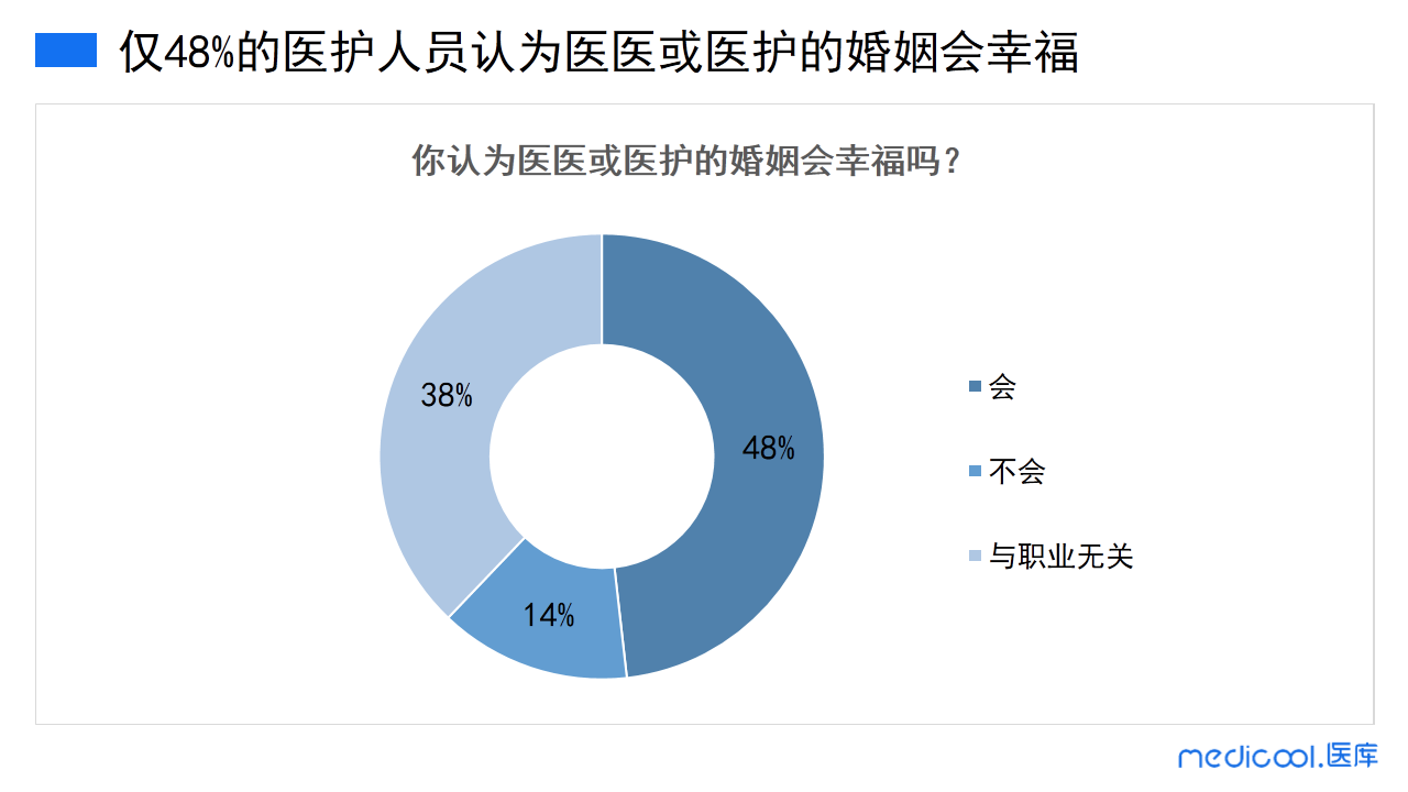 由调研数据可得知,仅48%的医务人员认为这样的婚姻会幸福美满的,14%的医务人员认为这样的婚姻不会幸福,而剩下38%的医务人员认为婚姻幸福与职业无关。