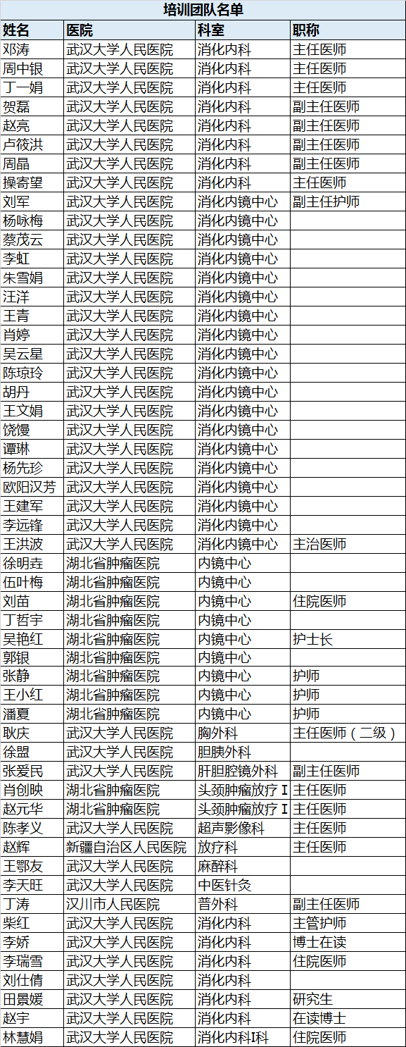 参加《消化专栏》的培训团队来自武汉大学人民医院消化疾病相关的多个科室,其中包括消化内科、胸外科、肝胆外科、胰腺外科、胃肠外科、肿瘤科、超声影像、放射影像及介入科、中医药及针灸、麻醉科和ICU等资深医护专家!