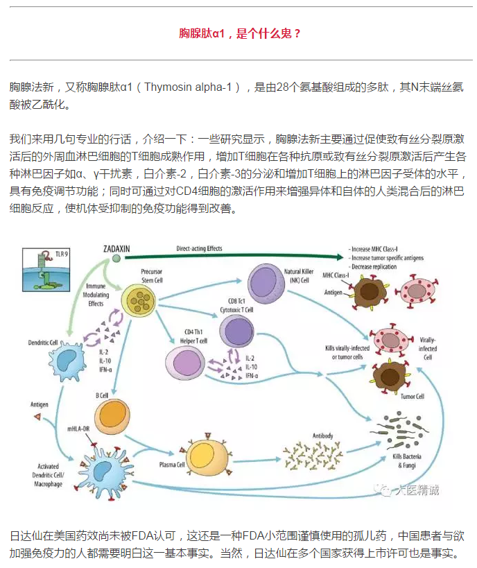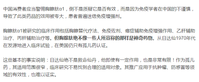 此前,大医精诚曾经发布过一篇《日达仙,真的是神仙药吗?》的文章,文中提出,胸腺肽绝不像一些人所宣称的那样是神奇药物。日达仙是由美国赛生药业公司(Sciclone)出品的一种胸腺肽(Thymosin)制剂,也就是注射用胸腺法新。而海南中和药业的主力产品之一“和日(注射用胸腺法新)”就是日达仙的一款仿制药。