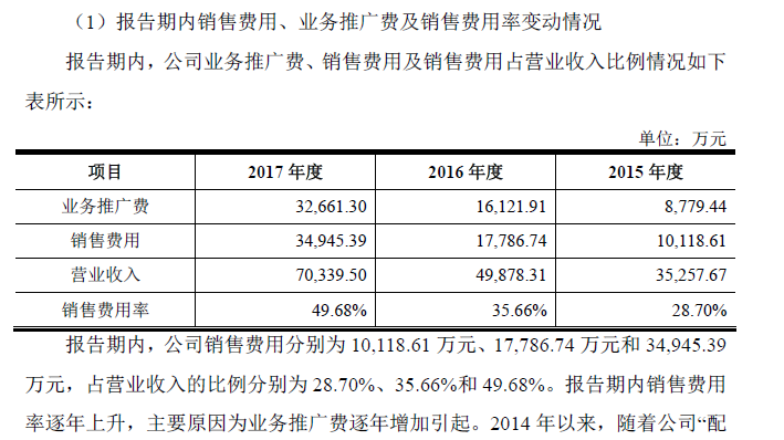 2015、2016、2017年业务推广费分别为0.88亿元、1.61亿元和3.27亿元,占营业收入的比重分别为24.90%、32.32%和46.43%;