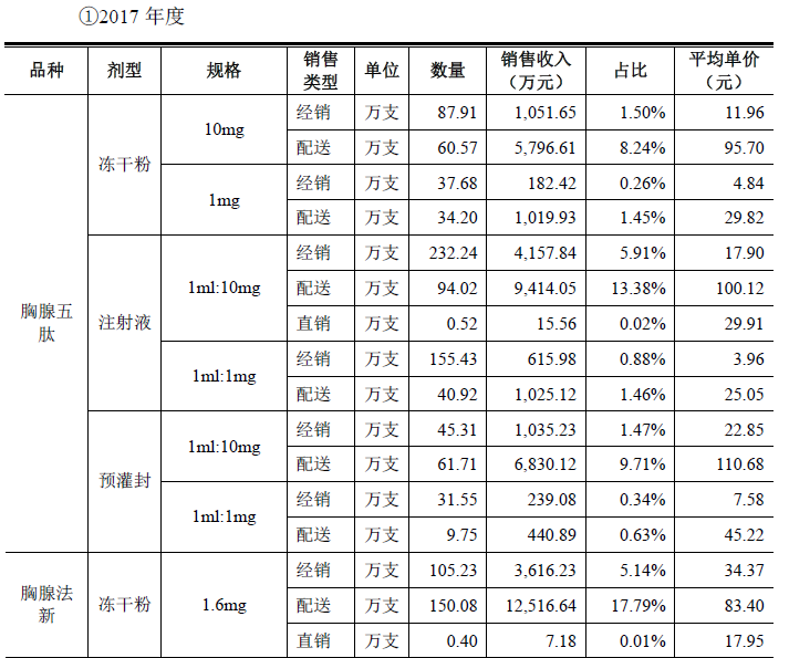 公司主要采用经销商和配送商模式进行产品的销售,直销模式基本可以忽略不计。而销售模式中,以核心品种胸腺五肽冻干粉10mg规格为例,经销商价:配送商价≈1:8,其他规格及产品的经销商单价基本上也只有配送商单价的1/5或更少。