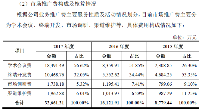 招股说明书中披露,公司的业务推广主要包括学术会议活动。2015-2017年,学术会议费分别为2308.85万元、8359.91万元及18491.49万元,2017年占销售费用的比例超过50%。