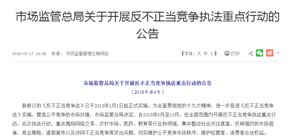 5月17日,国家市场监督管理总局发布《关于开展反不正当竞争执法重点行动的公告〔2018年第4号〕》。