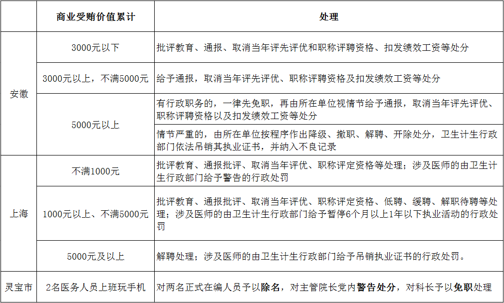 与医生上班看手机相比,医生收受回扣的行为危害性更大,更应被揭露于大众,受到更加严厉的处罚。但实际上,医生收受回扣在未涉嫌犯罪不移送司法机关追究刑事责任的情况下,处罚也主要以通报、批评教育、警告或较轻的处罚为主(以《上海市医药购销领域商业贿赂不良记录管理规定》和《安徽省医疗卫生机构及其工作人员收受商业贿赂处理办法(试行)》为例)。