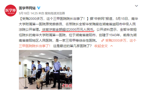 2018年5月15日,南华大学附属第一医院原党委委员、名誉院长全智华受贿案在湖南省益阳市中级人民法院公开审理。全智华夫妻二人索取或非法收受有关单位、个人给予的财物,共计人民币1675万余元、美金15万元、澳元46万余元,共折合人民币2075万余元。其中被告人王萍与被告人全智华共同索取或非法收受人民币共计715万余元。因案情重大复杂,法庭宣布将择期宣判。