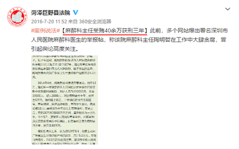 2016年,历经四次审判的深圳市人民医院麻醉科陶明哲主任受贿案终于尘埃落定。虽然他在此期间主动向广东省卫生厅廉政账户退款,并再次上诉,但被深圳市中级人民法院驳回,维持有期徒刑三年,处罚金30万元的原判。