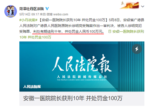 2018年5月8日,经查明,徐明亮在担任广德县中医院院长、广德县人民医院院长期间,利用职务上的便利,为他人在医疗器械招投标、药品采购、货款回收等方面提供帮助,非法收受医疗器械销售商、药品供应商、工程承建商现金403.2万元人民币、1000美元、500欧元。被判处有期徒刑十年,并处罚金人民币100万元。