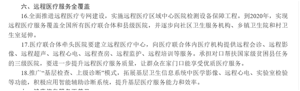到2020年,实现远程医疗服务覆盖全国所有医疗联合体和县级医院,并逐步向社区卫生服务机构、乡镇卫生院和村卫生室延伸。