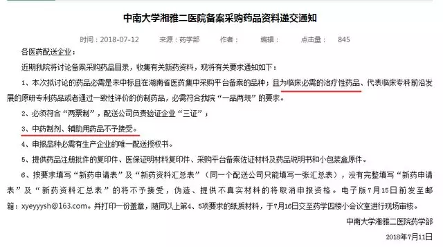 7月12日,中南大学湘雅二院在医院官网发布《备案采购药品资料递交通知》:
